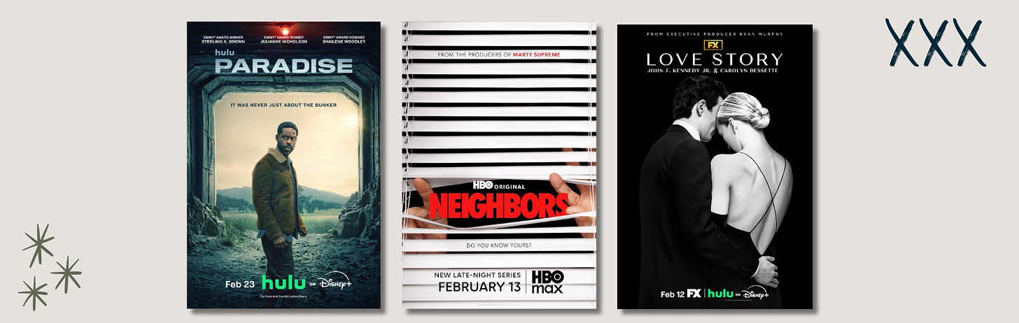 Begrudgingly enjoy: Love Story (FX on Hulu -reviewed here). I maintain a “leave these people alone” posture.. But the show is engaging and stylish. Similarly, I can’t look away from Neighbors (HBO) – a late night docuseries about small-scale feuds between neighbors, from a battle over beach access to conspiracy theorists and preppers duking it out over shared land boundaries.
