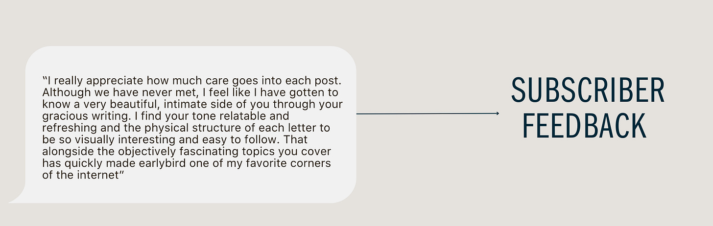 earlybird is an entirely reader supported publication. for weekly posts, behind the scenes and access to the full archive of 150+ issues, consider upgrading to a paid subscription – currently 20% off for a spring sale!