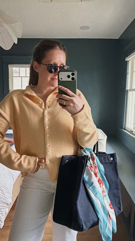 I am nothing if not an outfit repeater – the most worn item of clothing in my closet continues to be the j.crew rollneck sweater, but this butter yellow cotton cashmere cardigan and cableknit rollneck in a soft lavender are tied for a close second. I practically lived in this incredibly comfy one piece on our recent vacation, paired with an oversized white linen button down and a pair of pull on linen shorts.