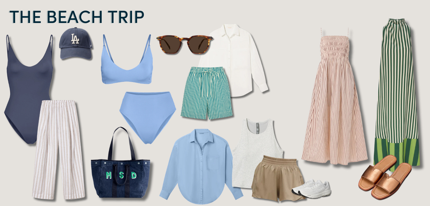 The details: I’m working with sandy neutrals, baby blues and navy, and the kind of sun-washed white linen that looks great no matter how wrinkled it gets. We’ve got a few pops of color, effortless silhouettes that flow, and layers that work as hard at 10 am on the sand as they do at 7 pm over dinner.